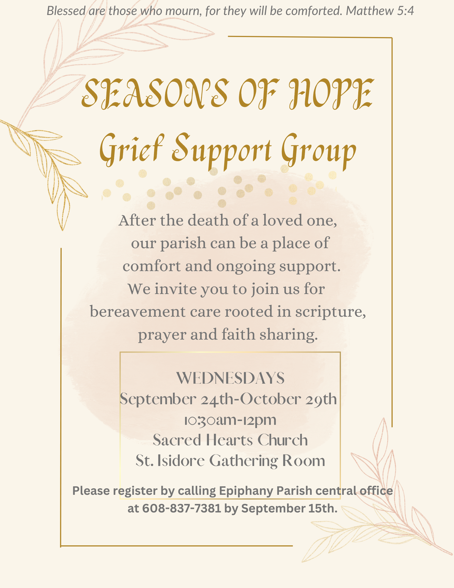 Our Lord assured us that those who mourn are blessed, and they shall be comforted. Seasons of Hope sessions help us explore mourning through scripture, prayer, reflection and faith sharing. For those searching for hope, a Seasons of Hope group is a nurturing link to the Church, the Almighty, and other people of faith who are also mourning. Come and be comforted.